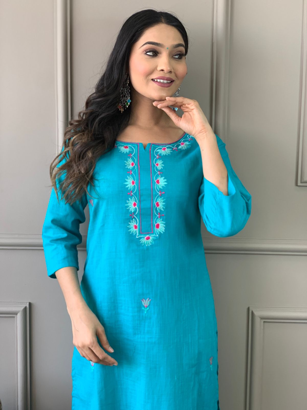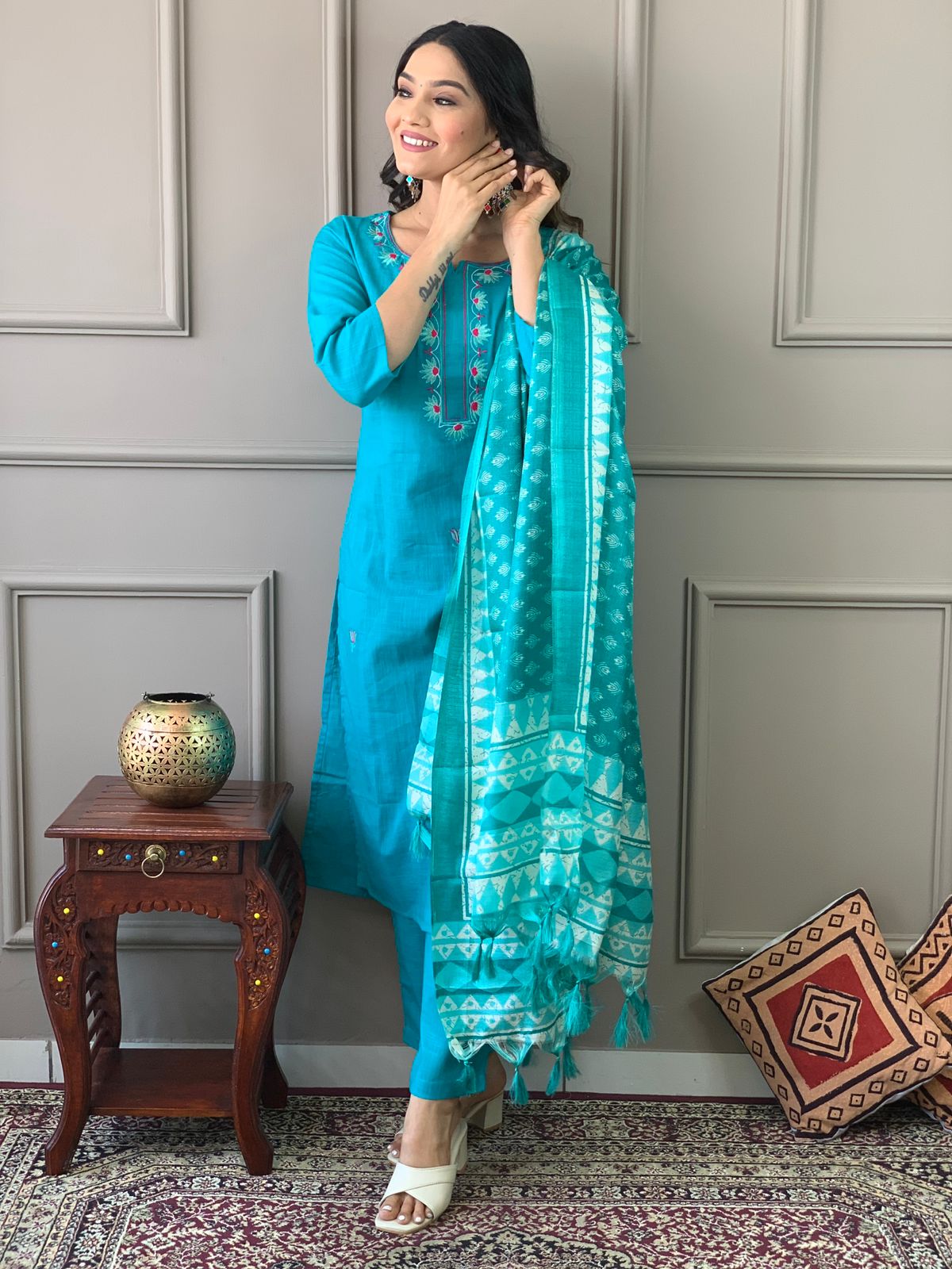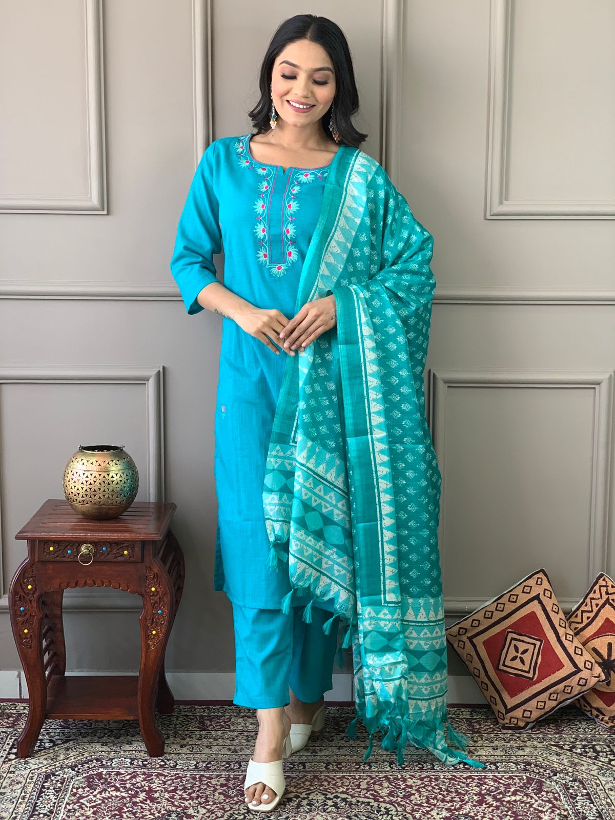 Presenting beautiful handloom rose embroidered khadi cotton kurti paired with khadi cotton pants and kantha print silk dupatta to complete the look 🔥