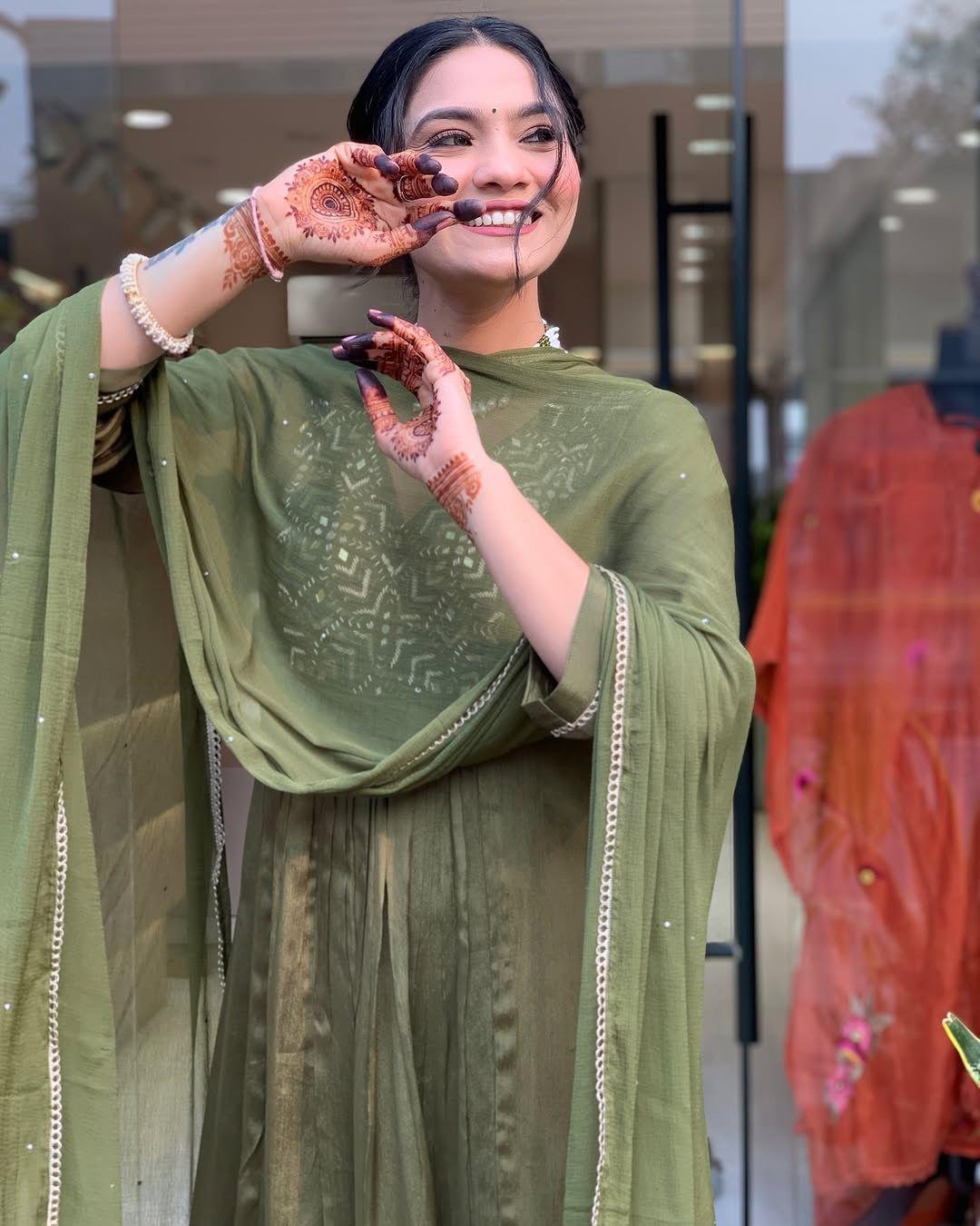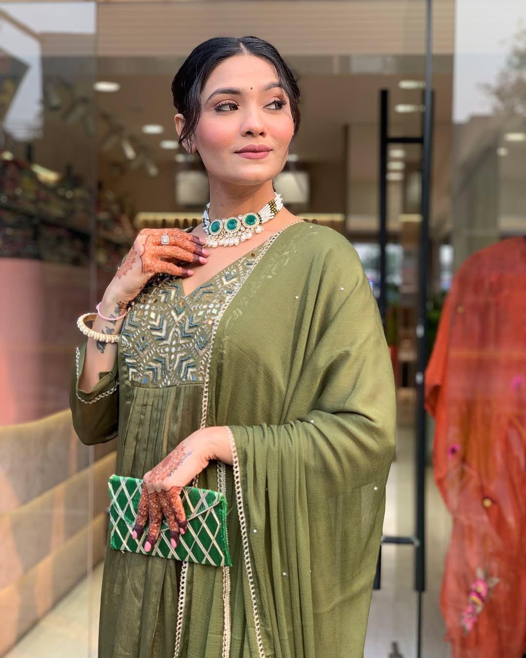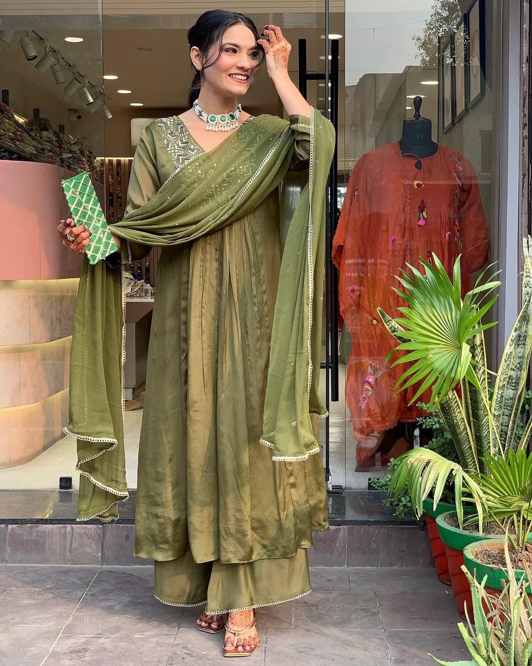 *Our Exclusive Collection is here, to add a touch of 😘 Tradition to your wardrobe.The outfit is made of Chinon fabric. This is a lightweight, often slightly sheer material known for its graceful drape and subtle sheen. It's a popular choice for ethnic wear due to its blend of comfort and elegance.* *The dominant color is a muted, earthy green. The embroidery is concentrated on the yoke The matching green Chinon fabric is used for the bottom. The dupatta is also in the matching. A thin, contrasting border is visible along the edges,*