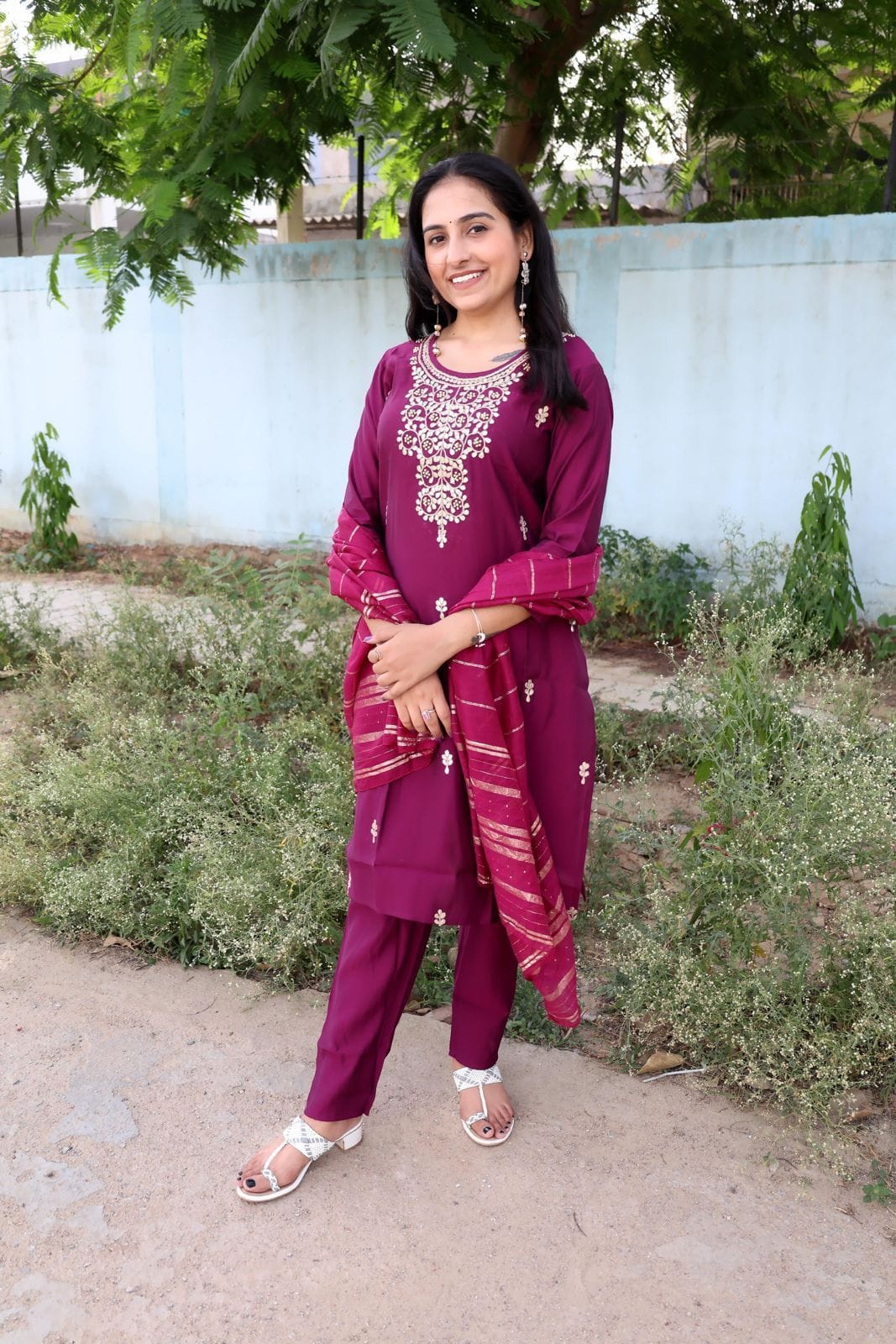 *Beautiful Roman modal silk kurti with classy comfort pant and chiffon jacquard sequence work dupatta*